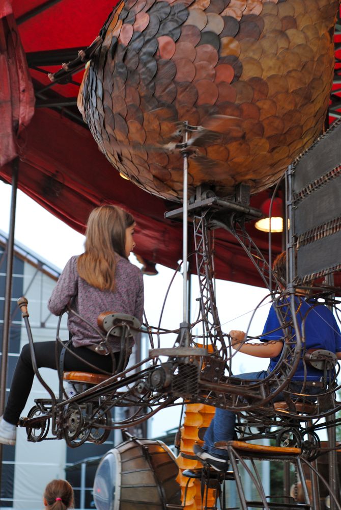 Ah! Nantes , je l’ai découverte il y a moins d’un mois et j’ai vraiment aimé , et j’ai adoré cette idée de plutôt que laisser mourir et se dégrader les friches de l’ancien chantier naval , de les recycler , d’y construire ce manège exraordinaire , cet éléphant , ces petits bars etc…
